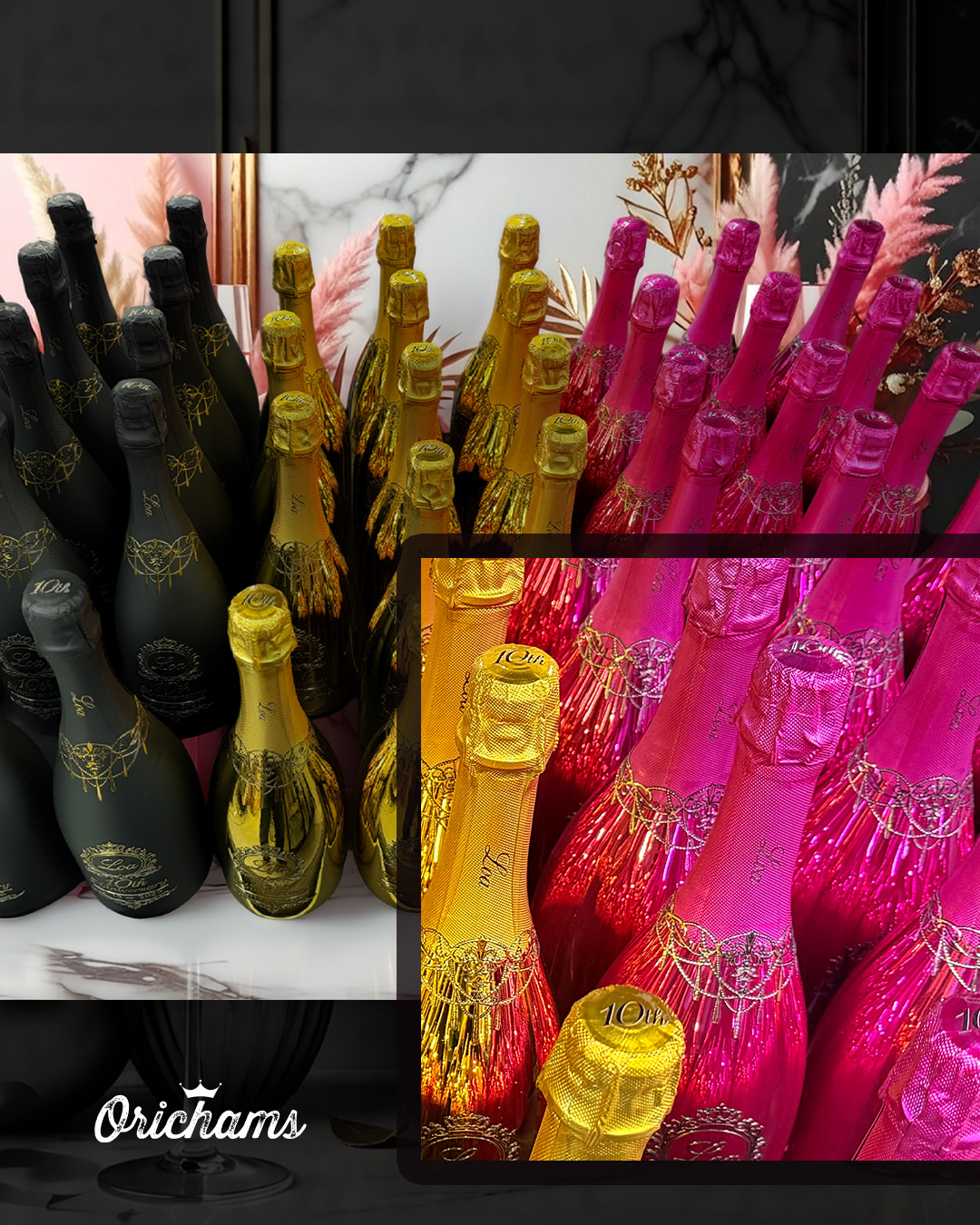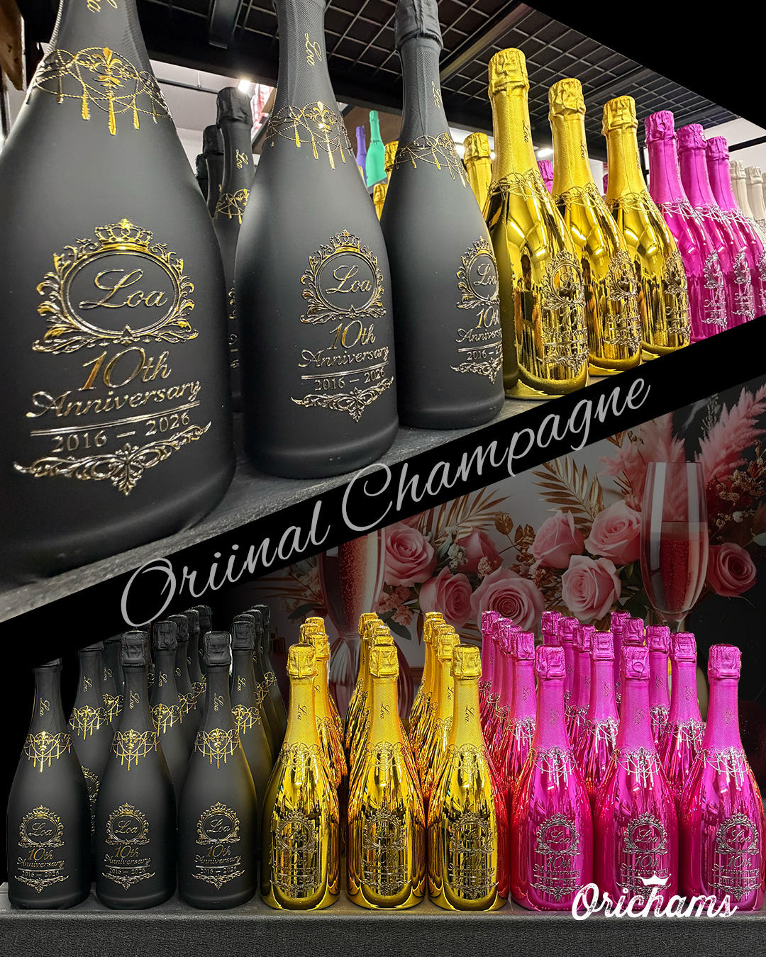 周年イベントやお祝いのシーンを華やかに彩る、高級オリシャン・オリジナルシャンパンの制作事例としてご紹介します。